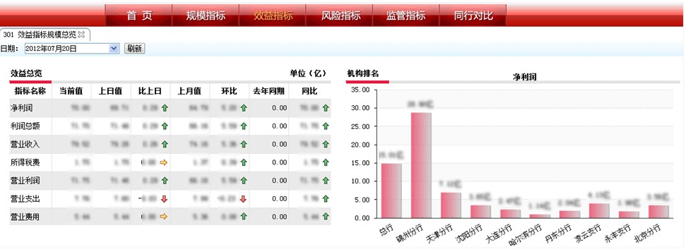 領導駕駛艙是對于管理者開放的模塊,包括管理者日常工作中最關注的指標,并且通過直觀的圖形的方式展示,便于管理者快速了解銀行的經(jīng)營狀況以及進行風險的預警。