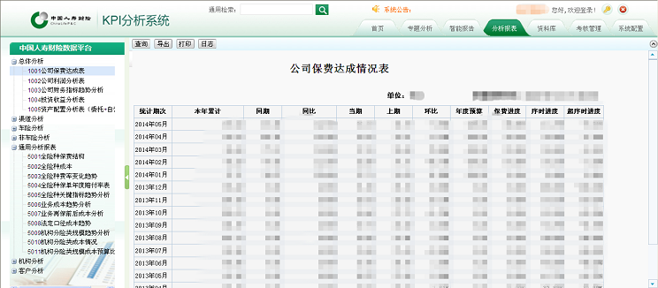 提供總體分析,渠道分析,車險分析,非車險分析,通用分析,機(jī)構(gòu)分析,客戶分析等數(shù)據(jù)分析服務(wù)。對保費(fèi)、利潤、成本、預(yù)算、收益等指標(biāo)進(jìn)行匯總統(tǒng)計。通過BI數(shù)據(jù)服務(wù)平臺完成以上統(tǒng)計分析報表的設(shè)計與制作,并將這些報表集成到中國人壽財險的業(yè)務(wù)平臺,在中國人壽財險業(yè)務(wù)平臺統(tǒng)一展現(xiàn)。