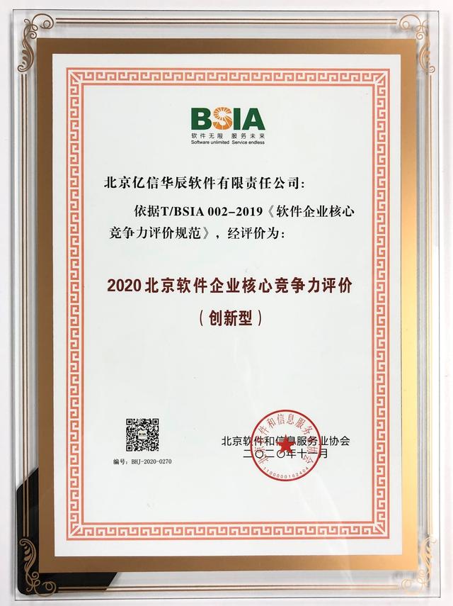 億信華辰榮獲2020北京市軟件企業核心競爭力評價(創新型)企業