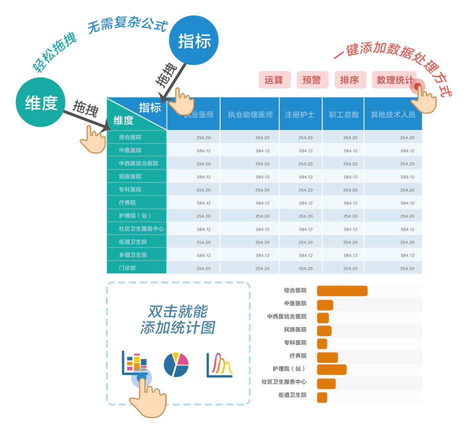 完全面向業(yè)務(wù)人員,充分理解當(dāng)下業(yè)務(wù)人員渴求自主探索數(shù)據(jù)的心情,只需要簡(jiǎn)單的鼠標(biāo)拖拽維度和指標(biāo),即可快速生成圖表。點(diǎn)選式數(shù)據(jù)預(yù)處理,智能的圖表推薦,全程無(wú)需編寫(xiě)表達(dá)式,零學(xué)習(xí)成本,一分鐘上手。敏捷看板中不僅內(nèi)置多種數(shù)據(jù)統(tǒng)計(jì)函數(shù),如:求和,最大值,排名,同比、環(huán)比、上期等,而且支持自定義維度和指標(biāo),兩者可以一鍵切換,靈活簡(jiǎn)便的分析方式,方便用戶(hù)進(jìn)行猜想式、求證式的數(shù)據(jù)探索。