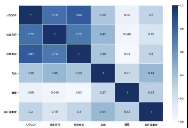 東南亞各國除了新加坡外的幸福指數排名處于世界中游。雖然并不理想,但相比于中國還是略高的。新加坡、泰國、菲律賓、馬來西亞、印度尼西亞的世界排名分別為:34,52,69,80,92。 中、東歐的總體水平雖然不如其近鄰西歐,但是依然處于世界前列。這份報告中東歐包含了部分中亞國家的成員國,這里所謂的東歐指實際上的中亞部分國家。車臣、斯洛伐克、波蘭、烏茲別克斯坦、立陶宛的世界排名分別是:20,38,40,41,42。 國外的報告熱衷于將臺灣和香港單列出來,這份報告也不例外。東亞國家和地區屈指可數,而我國卻不能居前五,只能說明我們仍需努力。臺灣、韓國、日本、香港和蒙古的全球排名分別為:25,54,56,78,83。 南亞諸國一直以來都是第三世界國家,其幸福指數也確實不夠理想。巴基斯坦、不丹、尼泊爾、孟加拉國、斯里蘭卡的全球排名分別是:67,95,100,125,130。 撒哈拉以南的非洲各國經濟落后,社會發展程度不高。毛里求斯、尼日利亞、喀麥隆、加納、科特迪瓦全球排名為:57,85,96,98,99。 我們發現幸福指數很高的這些國家都為發達國家,有可能是因為這些國家的人口基數少,發展精工業,社會制度以及良好的醫療保障等等因素。而一些發展中國家,例如中國,印度等國家處于中游水平,而幸福指數最低的幾個國家大部分都集中在非洲地區,可能是因為,非洲地區的經濟效益不好,戰亂等因素導致的。下面我們研究各個指標對幸福指數的影響,看看什么指標對幸福指數是影響最大的,換句話說,什么能使人民感到幸福? 我們對合成幸福指數所用到的分數進行相關系數的計算可以發現,人均GDP與社會支持和預期壽命之間具有高相關,相應的社會支持和預期壽命也存在高相關。自由與其他因素只有中等程度的相關,而慷慨(捐款)、政府清廉度與其他因素的相關度都不高。 上述的結果表明,經濟可能對預期壽命和社會支持都有很強的影響,自由在一定程度上會影響其他因素,而捐款和政府的清廉程度與其他因素的關系并不明顯。 由此可推論,發展經濟是促進幸福的硬道理,無論是預期壽命還是社會支持都要有經濟基礎。政府要保持一定程度的清廉才能有利于其他方面的發展,保證人們的自由也是為幸福提供保障,為其他方面得以發展的必備條件。 04 中國幸福指數分析 我們將中國在各指標上的得分與該指標上得分最高的十個國家進行對比,分析中國排名落后的原因。對人均GDP的分析可以發現,中國的人均GDP排名全世界第70位,據此來看,中國在發展中國家的地位是穩穩當當。 我國的社會支持在世界排名中為108名。有人說如今的中國社會人情淡漠,缺乏人與人之間缺乏互助精神,這可能是由于我國人口眾多,資源有限,競爭激烈造成的。人們都在忙于為自己的生活奔波,沒有時間去顧及別人。一帶一路在世界范圍內交朋友,我們是不是該先想想,怎么和身邊的人交朋友呢? 我國的預期壽命排名世界第37,可以說是很了不起的成績了。試想發展中國家這么多,我們卻能在預期壽命上處于世界前列。說明我國在醫療領域和民生領域的建設上發展迅速。 我國的自由指標的世界排名為32,可以說即使我們有看不見的墻,有諸多言論方面的管控,可是我們已經享有了很高程度的自由。自由對營商的重要性不必多言,市場經濟能高效運轉,自由是前提。 我國的捐款指標的世界排名僅為147,這一點可能是拖累我國幸福指數的最大原因。我們的公益事業發展狀況很不好,沒有形成規模較大且靠譜的公益組織,相關的人才隊伍也沒建設起來,民眾的捐款意識也不強。可能的原因或許是政府包辦了許多工作,更可能與我國沒有做公益的文化有關。希望未來這一情況得以改善,讓社會充滿愛。 我國的政府清廉度排名為59,這說明近幾年中央主持的反腐工作還是比較到位的,同時也說明,我國過去的腐敗情況確實堪憂。 對過去五年的中國在各指數上的全球排名的變化可以發現,預期壽命基本保持不變,人均GDP緩步上升,政府清廉度急速上升,捐款狀況在低位徘徊,人民自由先降后升。可以反映出,我國的反腐斗爭成績喜人,經濟建設還需努力,民生醫療建設成果要繼續保持,為了更好的發展,我們需要更高質量的自由。 為什么反腐進步如此之大卻沒有使我國的幸福指數進步巨大?是因為在18和19年計算幸福度時,相比于之前,去掉了一項占比非常大的分數(反烏托邦指數)造成的。 05 結論 結合上述分析,我們可以發現發達國家的幸福指數普遍比發展中國家高,因為發達國家的經濟水平較高,而無論是預期壽命還是社會支持都要有有經濟基礎,經濟的發達程度,可能在很大程度上影響了幸福指數的評分,所以我們應該大力發展經濟,增加人民幸福感。 但是,這并不意味著只要經濟發展了就一定會幸福。經濟發展是一個可以量化的指標,人們的確能夠從財富的增長中獲得一些幸福,但是還有許多因素,例如:房價飛漲,物價上漲,環境污染也會影響人們的幸福感。比如說2008年,房價迅速攀升,盡管人們的收入也提高了不少,但總也趕不上房價上漲的速度,現在全民都在關注房價的問題,在這種情況下很難談的上幸福指數的提高。 所以,經濟發展固然重要,但是我們也不能一味的發展經濟,在發展經濟的同時也要提高各方面的綜合素質,比如,降低失業率,為人民提供良好的醫療、社會保障等等。與此同時,政府需要保持清廉,才更有利于