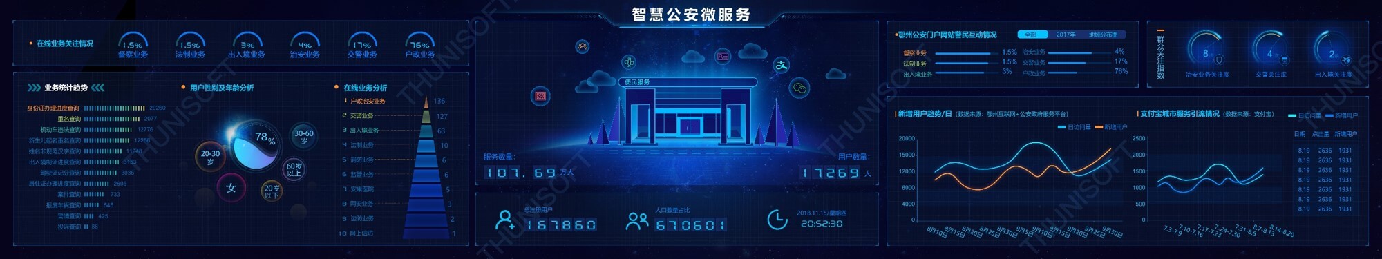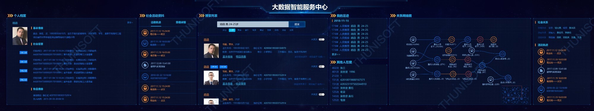 智慧公安實戰應用包括了智慧搜索、智慧建模、智慧服務、智慧監督、智慧標簽、智慧小區、智慧管控以及智慧監測,實現個人檔案的查詢,同時關聯社會關系和活動軌跡并繪制出關系網絡圖,通過建模顯示各模型使用情況和資源訪問量、訪問趨勢,進行在線業務分析,各類警務案件指標分析,根據標簽標準生成人員畫像,通過重點人員異常軌跡進行警情監測,根據熱點追蹤進行傳播路徑分析,實現公安智慧化管理。