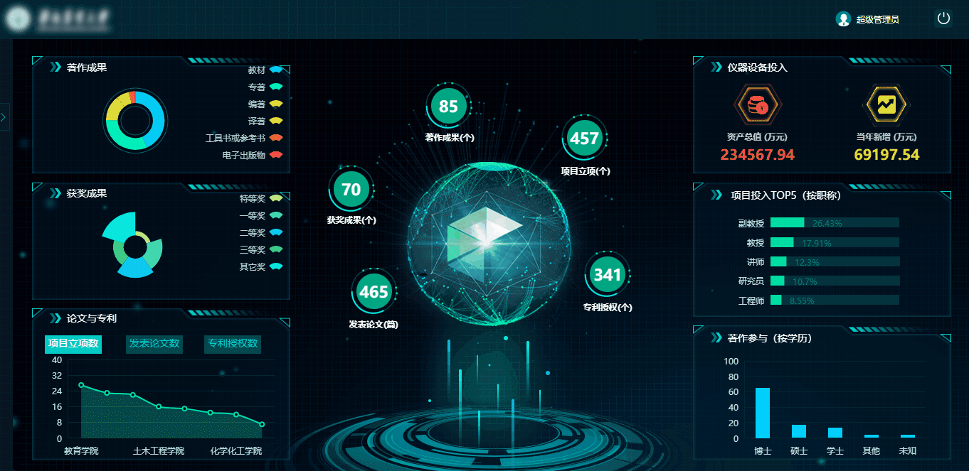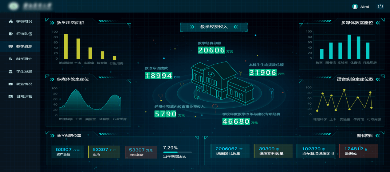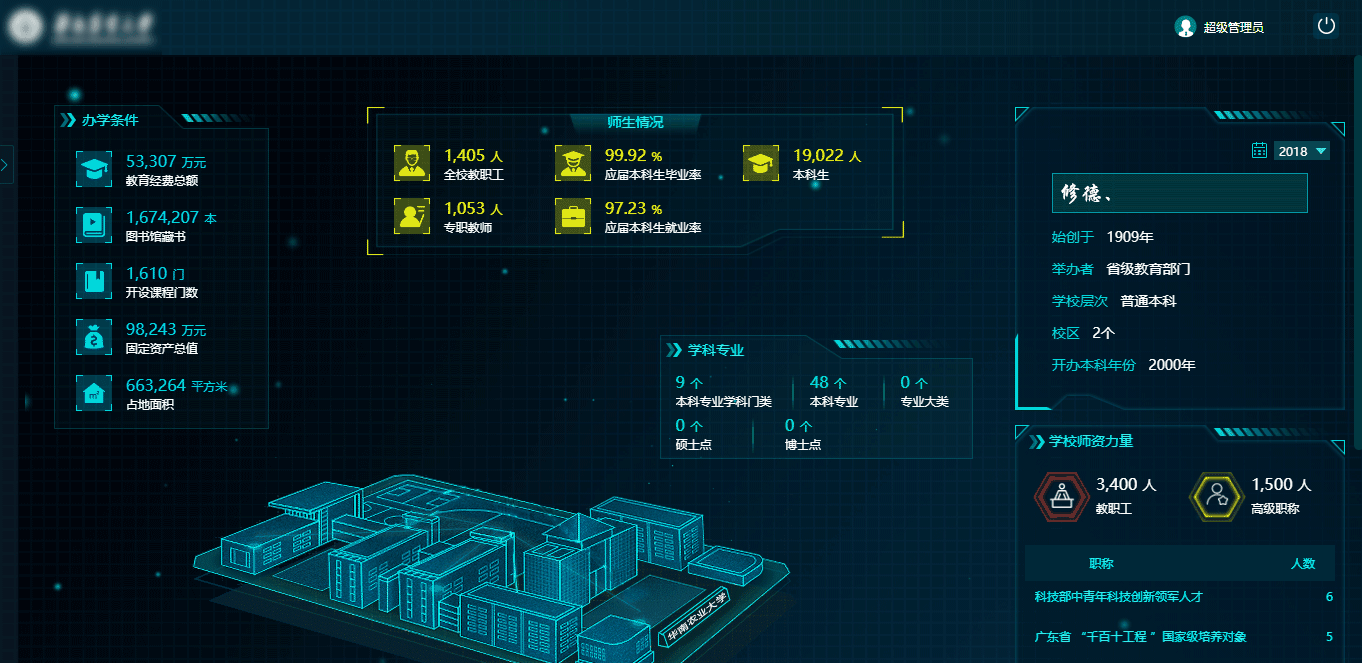 為了展現學校的實力,分別從學校概況、師資隊伍、教學資源、科學研究、學生發展、就業情況和日常運營的角度來展示。學校概況包括辦學條件、師生情況、學科專業和師資力量,再通過榮譽稱號、教師編制類別、教職工人數、研究生導師數、高層次人才、職稱分布、最高學位分布等展示師資隊伍,用教學用房面積、教學經費投入、教學科研儀器、圖書資料等來表現教學資源,用著作成果、獲獎成果、論文與專利等展現科學研究。