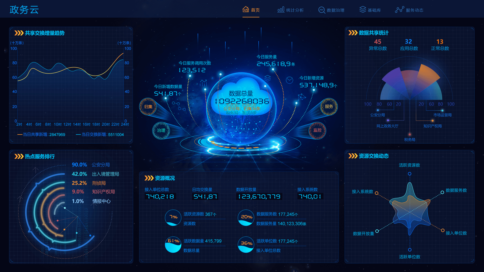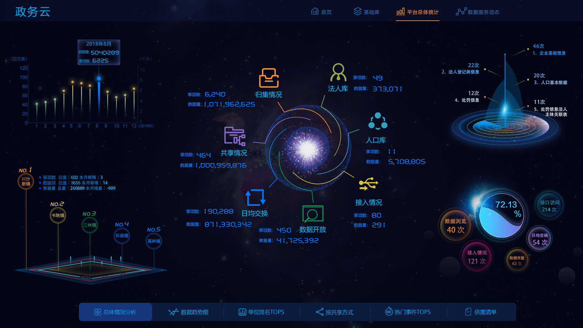 首頁展示共享方式占比、共享屬性占比、數據趨勢、熱門事項、和單位排名等,基礎庫包括人口庫、法人庫,支持搜索刷新,同時展示庫的基本信息和申請動態,平臺總體統計展示平臺各類指標數據的訪問、更新情況,數據服務動態展現區數據中心和市數據中心等的數據實時交互狀況,實現數據全方位全時段把控。